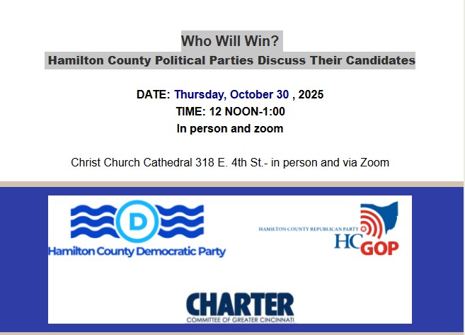 The Next Community Issues Forum will be on Thursday, October 30, noon. Topic Who Will Win? Hamilton County Political Parties Discuss Their Candidates